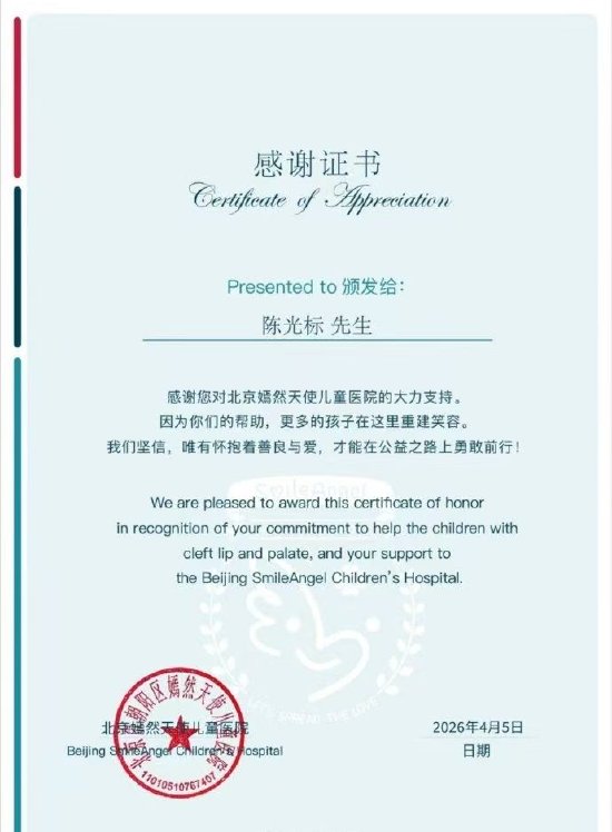 4月7日,北京嫣然天使儿童医院发文感谢慈善家陈光标捐款1000万元,并晒出感谢证书。