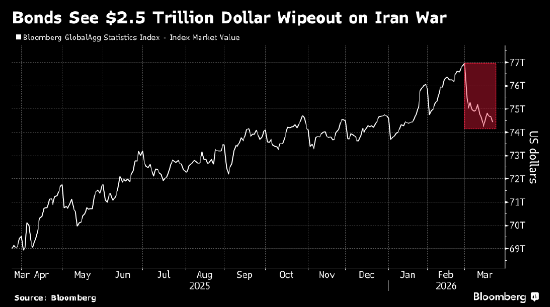 伊朗战争引发滞胀担忧,已导致全球债券价值在3月蒸发超过2.5万亿美元,势将创下三年多来最大单月跌幅。