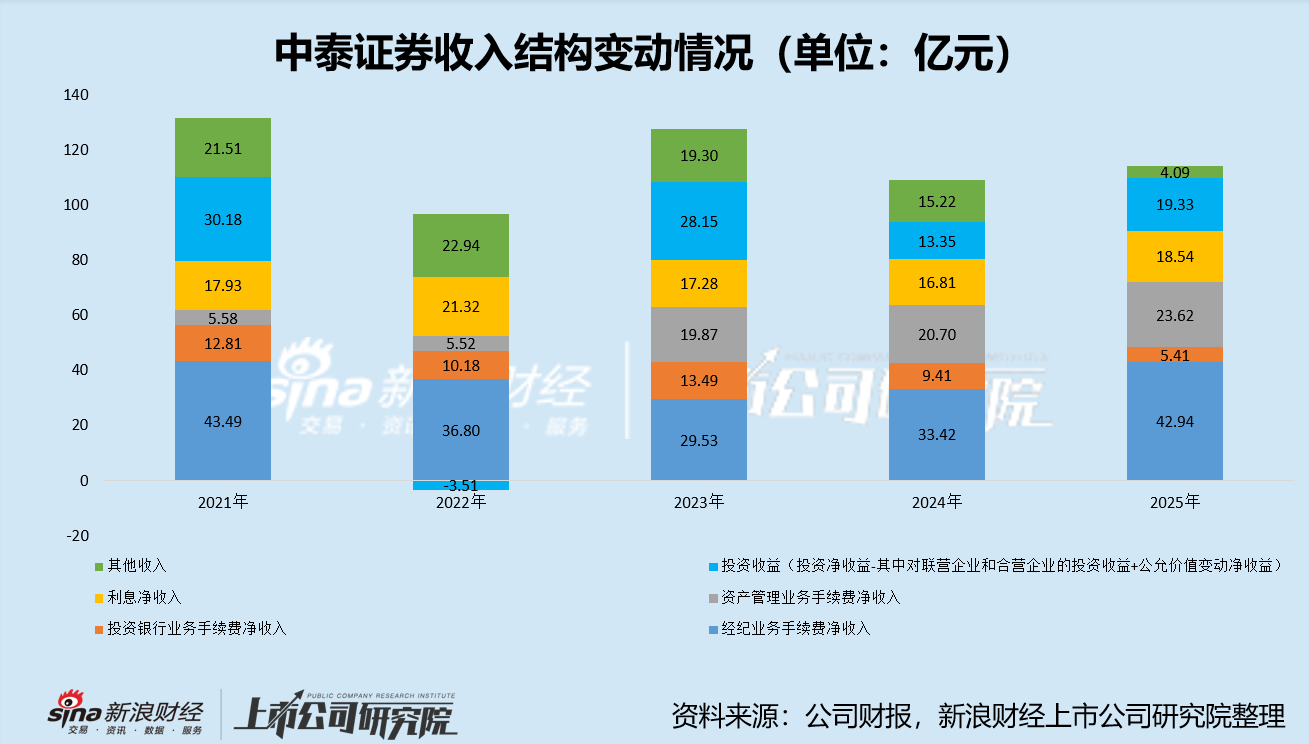 2021年到2025年这五年间,中泰证券营收整体下降17.57亿元,其中经纪业务、投行业务、自营业务分别下降0.55亿元、7.4亿元、10.85亿元,资管业务包含并表因素在内的收入增长为18.04亿元,难以抵消其他业务的营收下滑。